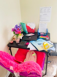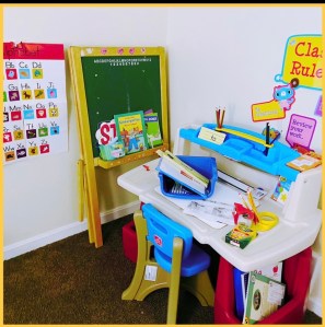 I created Heaven and Jeremey Jr. separate learning spaces. I made sure the spaces were outside of their rooms so that they can focus. These areas are only reserved for learning. I tried to make sure that they have everything they need for school and to keep it cute and colorful like a classroom environment.